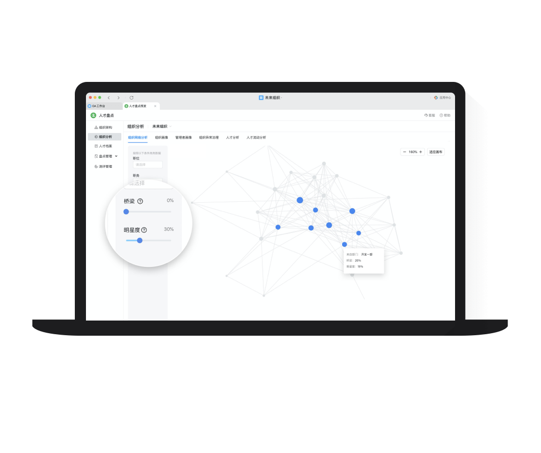 組織分析通過大數據智能分析,刻畫組織和人才畫像,描繪組織溝通網絡行為,幫助看清組織現狀,并跟蹤治理核心指標。