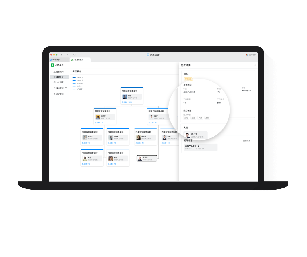 精準識人從戰功、經驗、能力、潛力、意愿、價值觀、組織行為等多維度看清人才,為用人決策提供量化依據,讓人崗匹配更精準。