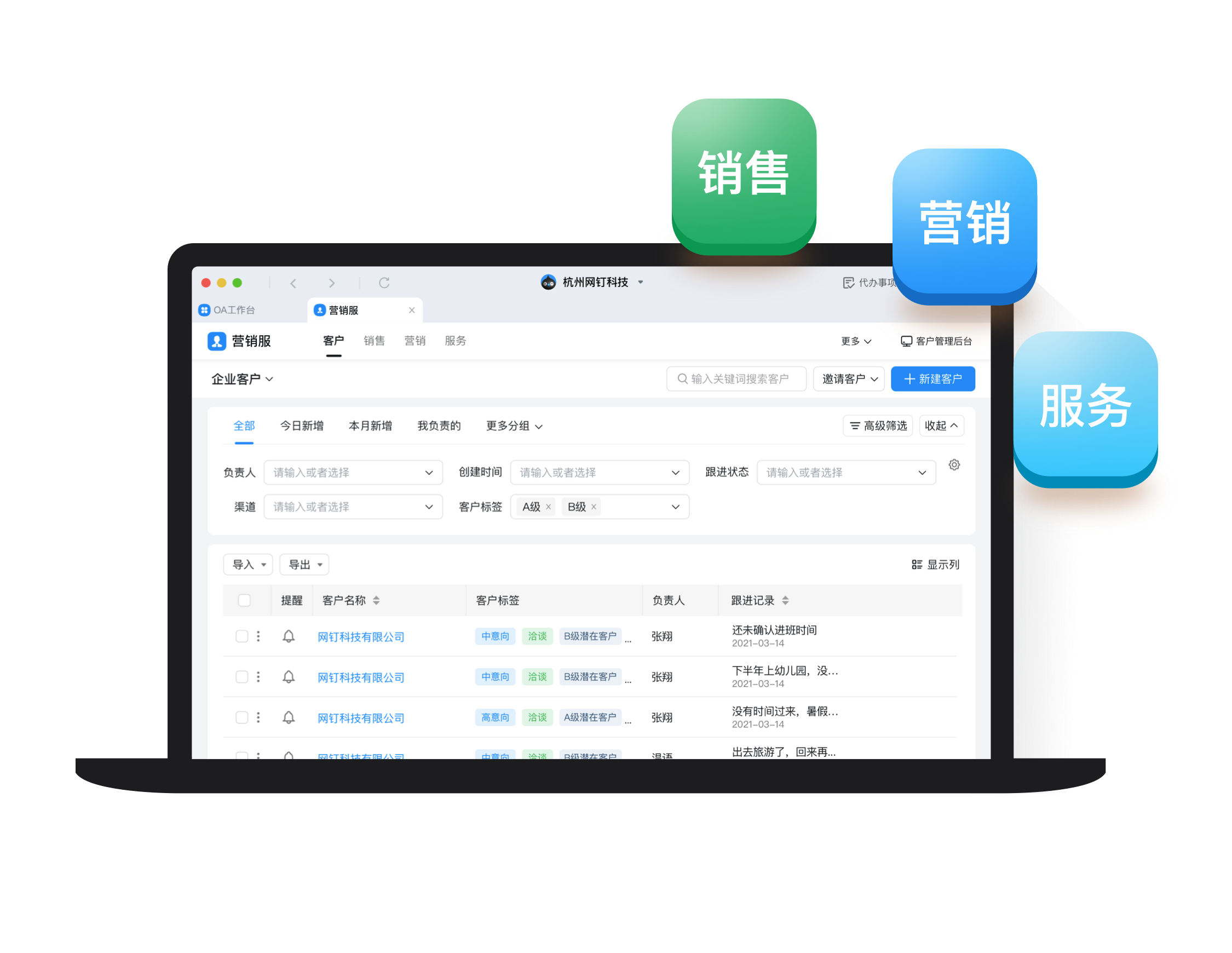 銷售跟進管理一體化集成營銷服工具,實現(xiàn)「營銷獲客 - 銷售跟進 - 合同回款 - 售后服務」全流程跟進,幫助提升銷售業(yè)績。